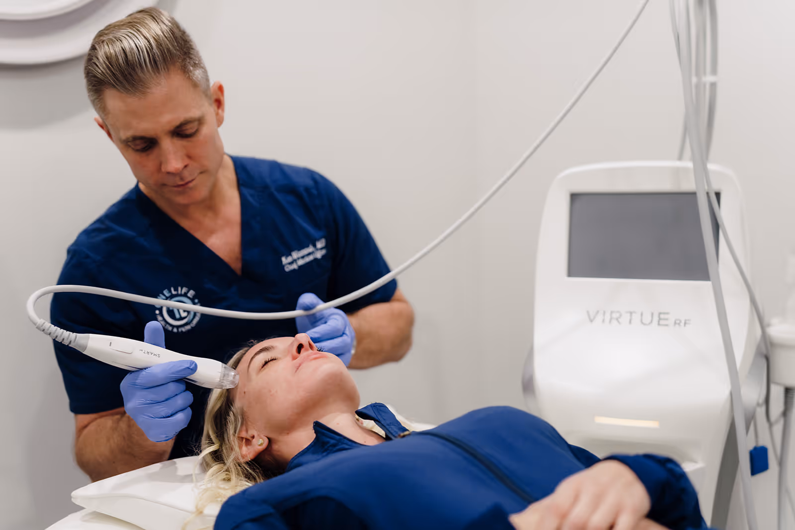 Our state-of-the-art Virtue RF system utilizes precision-controlled radiofrequency energy delivered through gold-plated microneedles to create targeted thermal zones at optimal dermal depths. This dual-action approach combines mechanical micro-injury with controlled thermal energy to stimulate intense collagen and elastin production, resulting in significant skin tightening, texture improvement, and wrinkle reduction that continues developing for months.